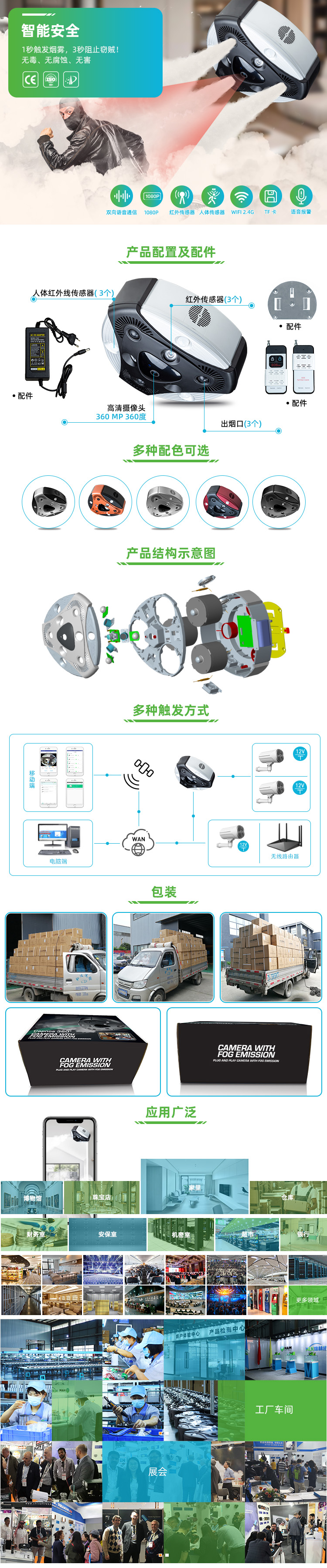 双向语音,内置语音警报系统。 可用WIFI/LAN连接,可提供系统接入、定制开发等技术支持。 180°广角高清摄像头,尽收眼底。 1S触发快速出烟,3S烟雾可保护关键区域。 即插即用,通过开关信号、紧急按钮、射频遥控器、手机APP控制触发烟雾。 设备无需预热/加热时间,烟罐更换操作简便。