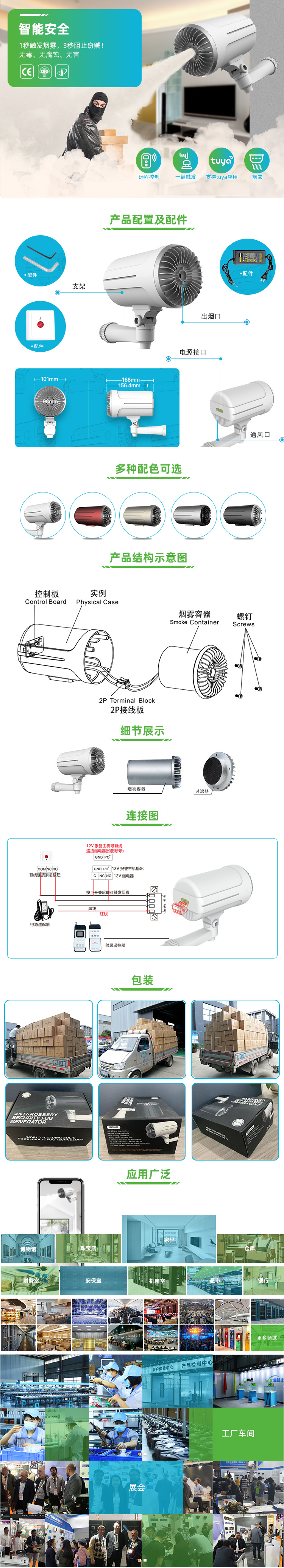 可通过涂鸦智能生活APP绑定设备,定义触发机制。 1S触发快速出烟,3S烟雾可保护关键区域。 通过开关信号、紧急按钮、射频遥控器触发烟雾。 设备无需预热/加热时间,烟罐更换操作简便。 烟雾器采用弱电启动,耗电量极低。 可与现有安防系统集成使用。